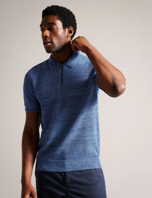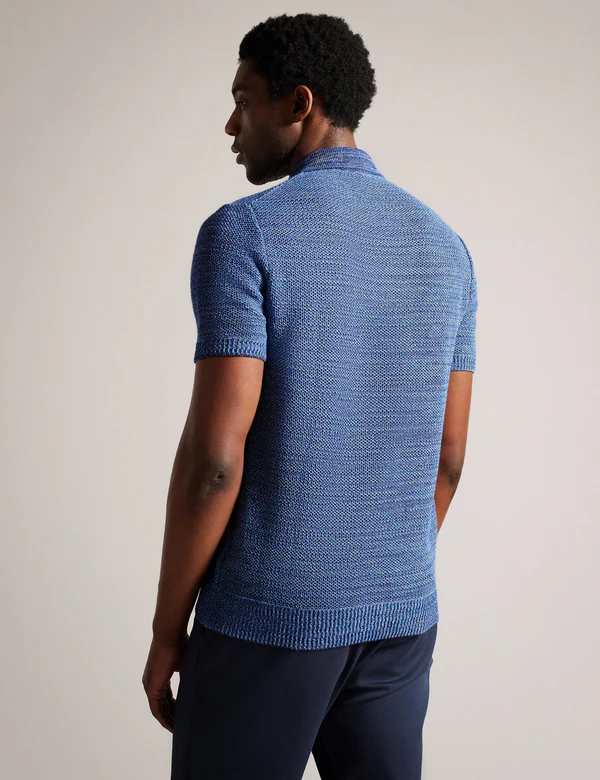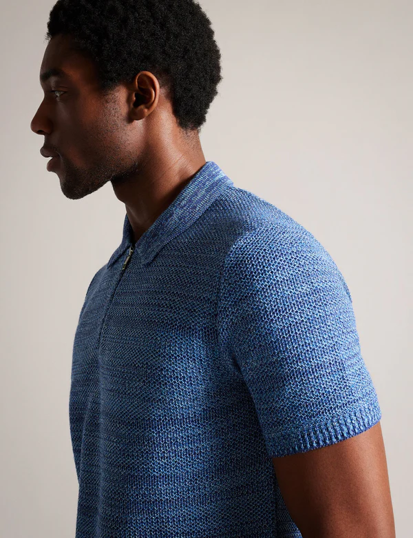 BLOSSAM is a new take on the classic polo shirt. We’ve used space dyed yarn to create a textured knit with a mix of tones, finished with a modern zip neckline. Sport this short sleeve piece with chinos or tailored trousers for an elevated casual look.