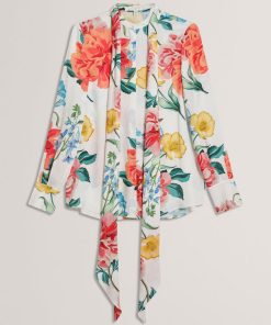 TED BAKER LUUSILEFloral Print Tie Neck Long Sleeve Blouse WHITE | New Tops & TShirts