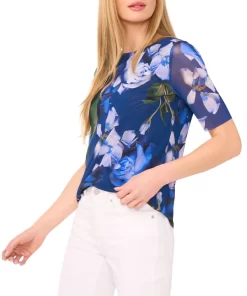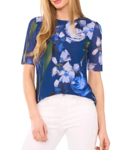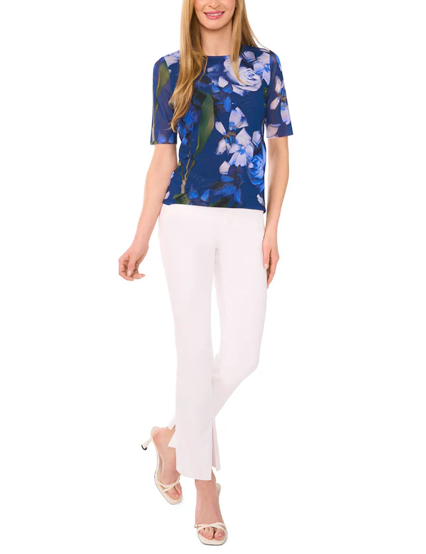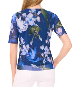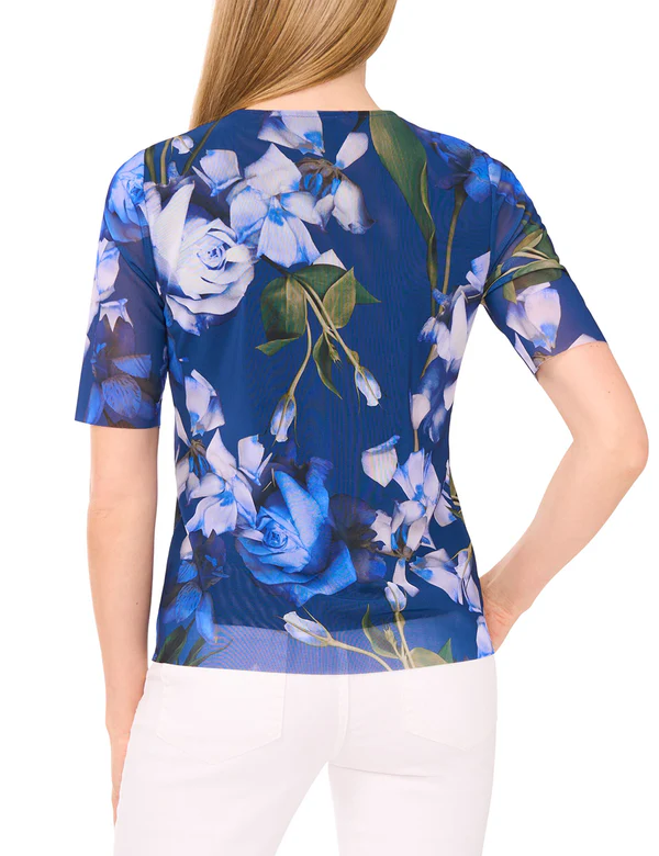 The Ted Baker Short Sleeve Lined Mesh Top features a delicate floral design with a sheer, airy mesh fabric for an elegant and breezy look.